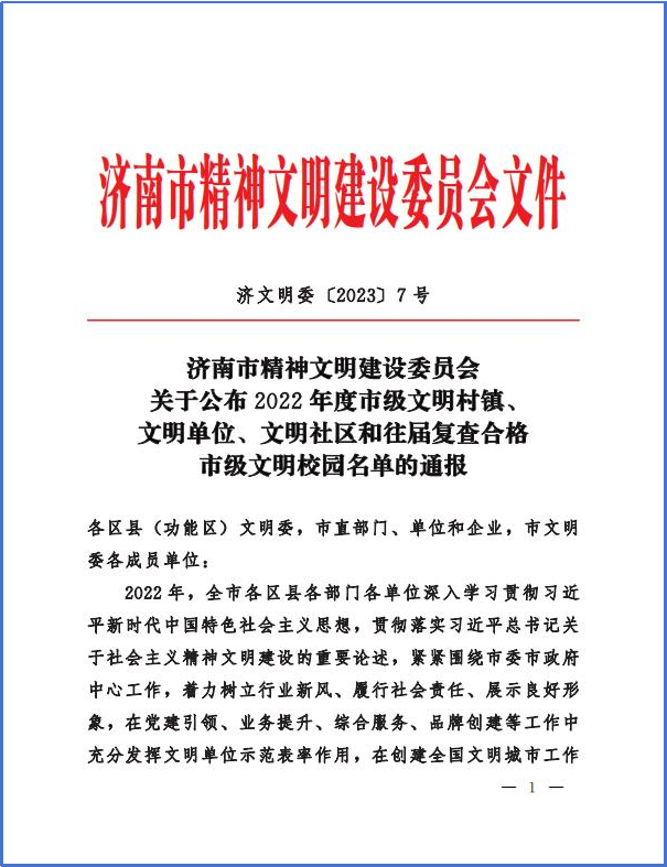 近日,濟(jì)南市精神文明建設(shè)委員會(huì)下發(fā)《關(guān)于公布2022年度市級(jí)文明村鎮(zhèn)、文明單位、文明社區(qū)和往屆復(fù)查合格市級(jí)文明校園名單的通報(bào)》(濟(jì)文明委〔2023〕7號(hào)),金衢設(shè)計(jì)咨詢集團(tuán)、及所屬金諾公司、金朝公司順利通過2022年度市文明單位復(fù)審,繼續(xù)保有市級(jí)文明單位稱號(hào),為新一年文明單位創(chuàng)建工作交出了一份滿意的答卷。